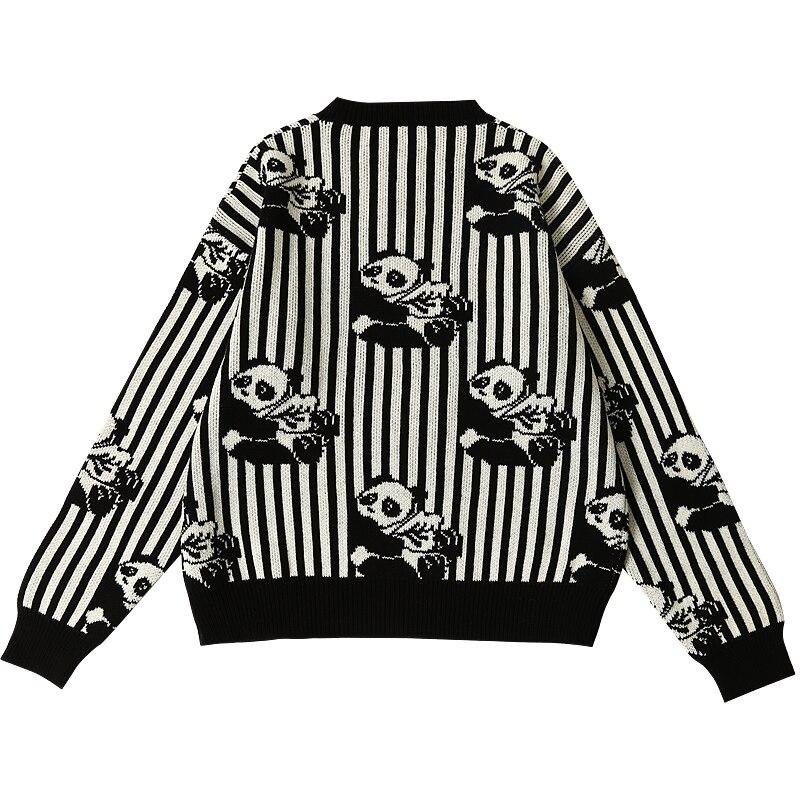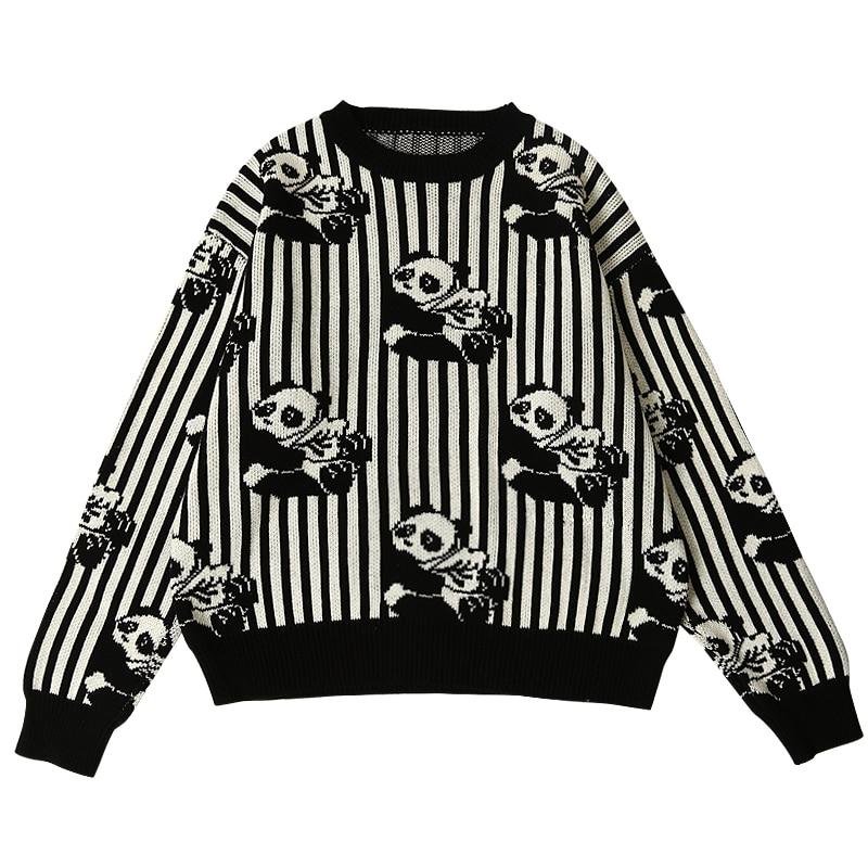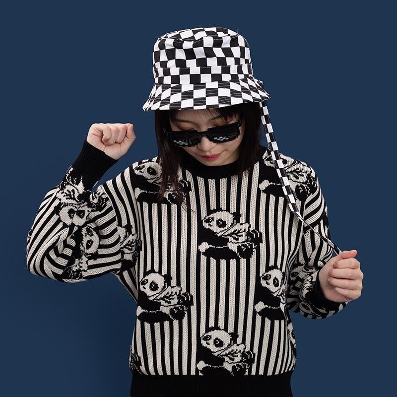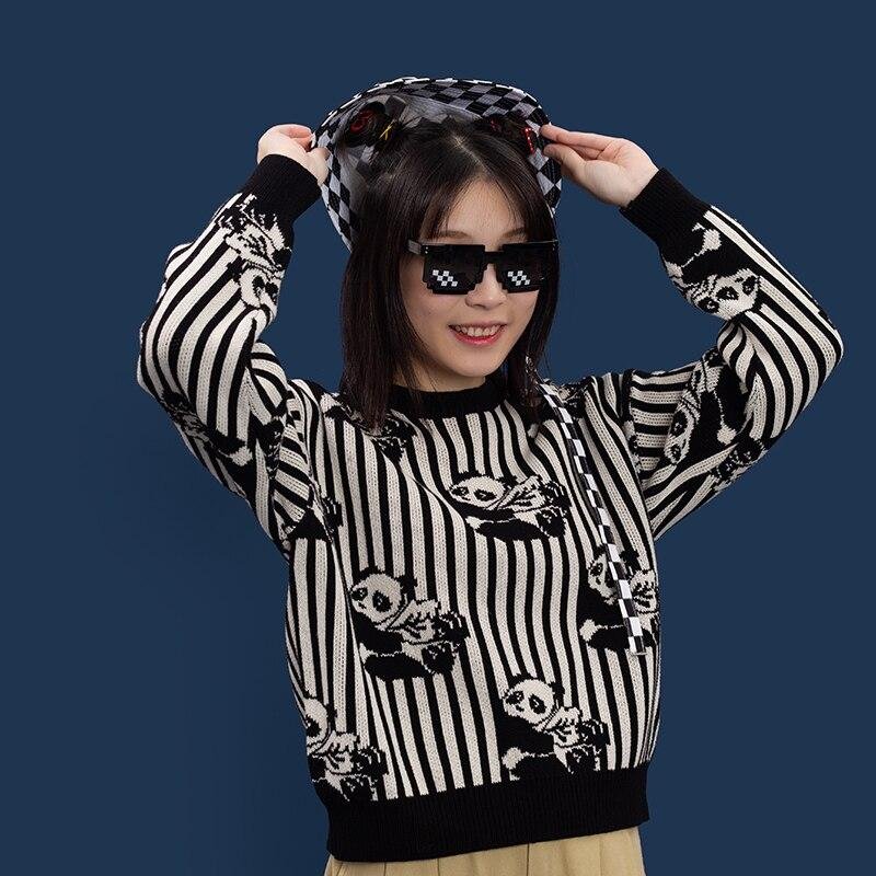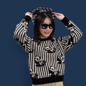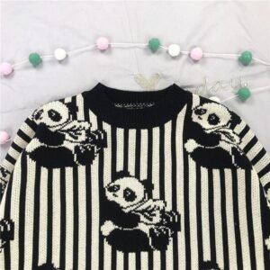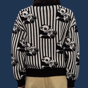 We love the original style and the winter side of this beautiful white sweater for women with its black stripes and its pretty print of several pandas too cute. Ideal for cooler weather, you will not be cold anymore thanks to its quality cotton blend fabric that offers you optimal comfort and warmth. It also has a cute v-neck and ribbed edges.